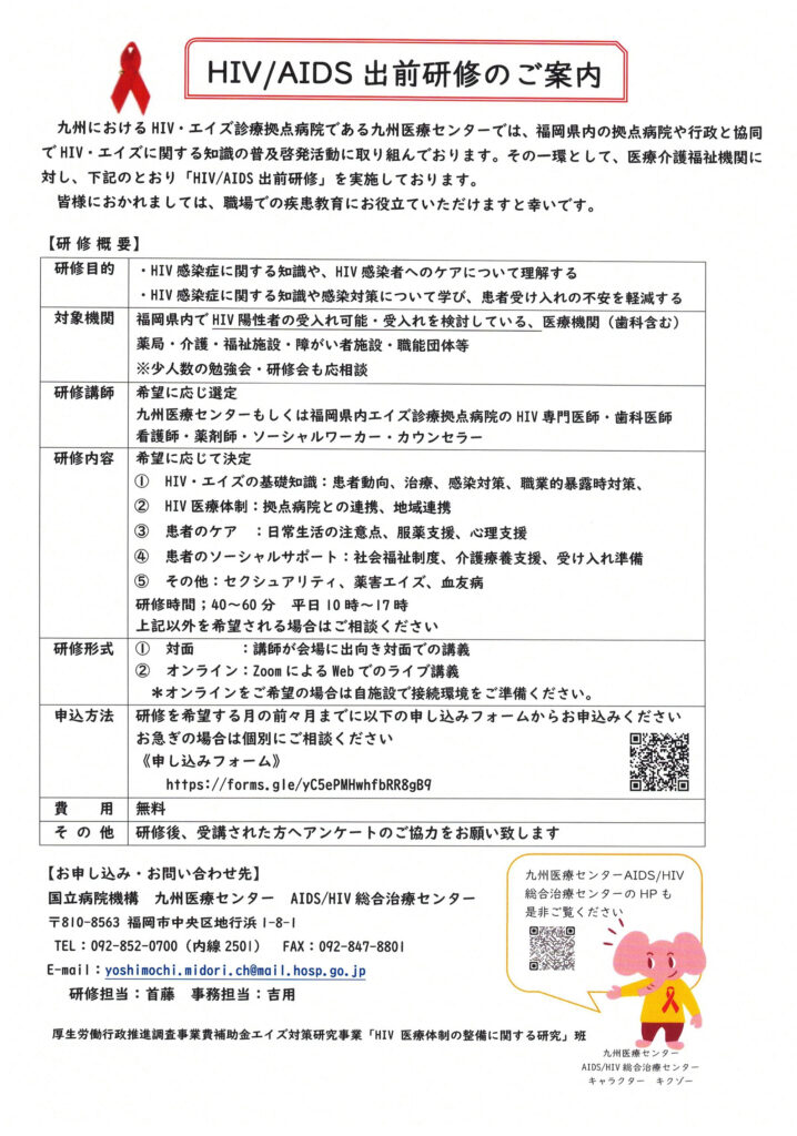 九州におけるHIV・エイズ診療拠点病院である九州医療センターでは、福岡県内の拠点病院や行政と共同でHIV・エイズに関する知識の普及啓発活動に取り組んでいます。その一環として、医療介護福祉機関に対し、「HIV/AIDS 出前研修」を無料で実施しております。